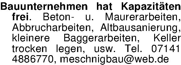 Bauunternehmen hat Kapazitäten frei. Beton- u. Maurerarbeiten, ­Abbrucharbeiten, Altbausanierung, kleinere Baggerarbeiten, Keller ­trocken legen, usw. Tel. 07141 4886770, meschnigbau@web.de