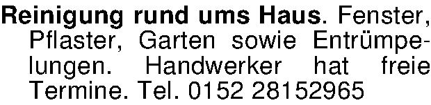 Reinigung rund ums Haus. Fenster, Pflaster, Garten sowie Entrümpelungen. Handwerker hat freie ­Termine. Tel. 0152 28152965