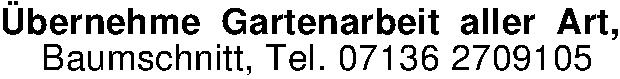 Anzeigentitel: Übernehme Gartenarbeit aller Art, Baumschnitt, Tel. 07136 270910