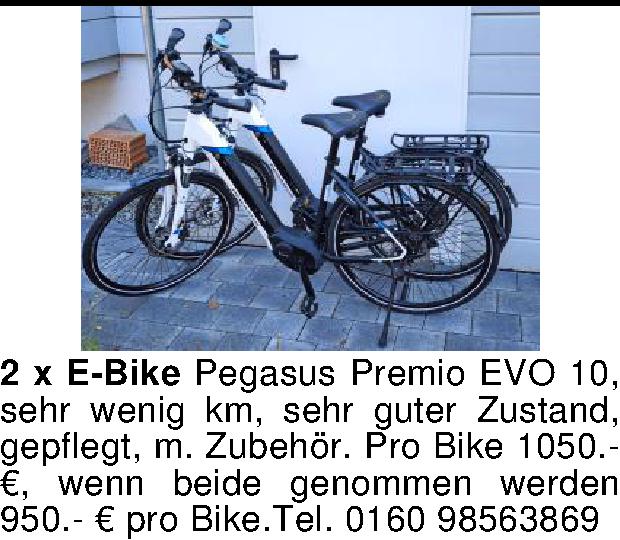 Anzeigentitel: 2 x E-Bike Pegasus Premio EVO 10, sehr wenig km, sehr guter Zust