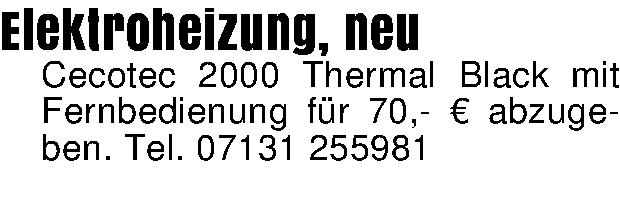 Elektroheizung, neuCecotec 2000 Thermal Black mit Fernbedienung für 70,- € abzugeben. Tel. 07131 255981
