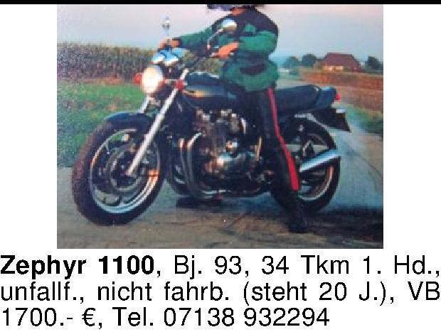 Zephyr 1100, Bj. 93, 34 Tkm 1. Hd., unfallf., nicht fahrb. (steht 20 J.), VB 1700.- €, Tel. 07138 932294