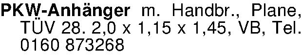 PKW-Anhänger m. Handbr., Plane, TÜV 28. 2,0 x 1,15 x 1,45, VB, Tel. 0160 873268