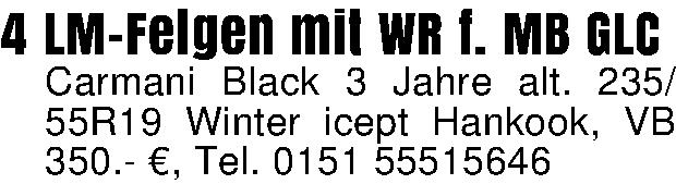 4 LM-Felgen mit WR f. MB GLC Carmani Black 3 Jahre alt. 235/55R19 Winter icept Hankook, VB 350.- €, Tel. 0151 55515646