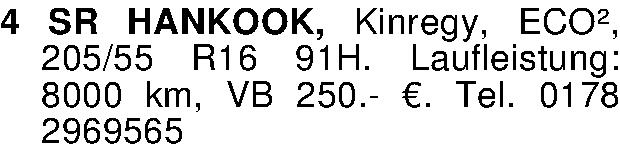 4 SR HANKOOK, Kinregy, ECO², 205/55 R16 91H. Laufleistung: 8000 km, VB 250.- €. Tel. 0178 2969565