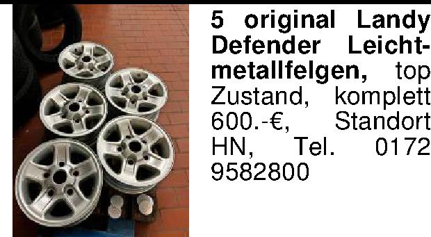 5 original Landy Defender Leichtmetallfelgen, top Zustand, komplett 600.-€, Standort HN, Tel. 0172 9582800