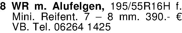 Anzeigentitel: 8 WR m. Alufelgen, 195/55R16H f. Mini. Reifent. 7 - 8 mm. 390.-