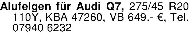 Alufelgen für Audi Q7, 275/45 R20 110Y, KBA 47260, VB 649.- €, Tel. 07940 6232