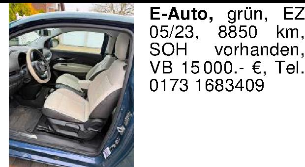 E-Auto, grün, EZ 05/23, 8850 km, SOH vorhanden, VB 15 000.- €, Tel. 0173 1683409