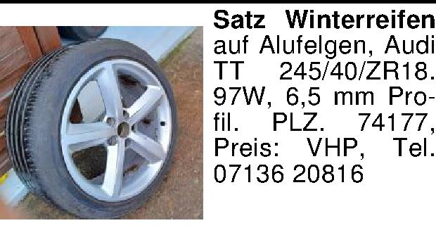 Satz Winterreifen auf Alufelgen, Audi TT 245/40/ZR18. 97W, 6,5 mm Profil. PLZ. 74177, Preis: VHP, Tel. 07136 20816