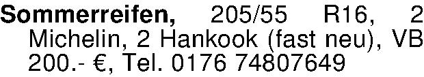 Sommerreifen, 205/55 R16, 2 ­Michelin, 2 Hankook (fast neu), VB 200.- €, Tel. 0176 74807649