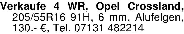 Verkaufe 4 WR, Opel Crossland, 205/55R16 91H, 6 mm, Alufelgen, 130.- €, Tel. 07131 482214