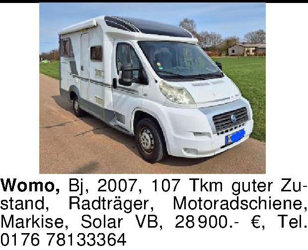 Womo, Bj, 2007, 107 Tkm guter Zustand, Radträger, Motoradschiene, Markise, Solar VB, 28 900.- €, Tel. 0176 78133364