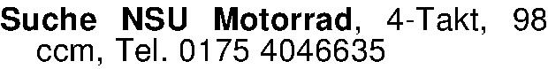 Anzeigentitel: Suche NSU Motorrad, 4-Takt, 98 ccm, Tel. 0175 4046635