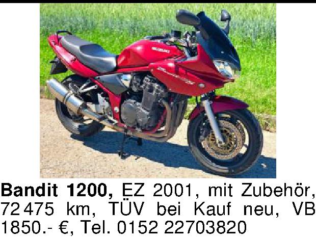 Bandit 1200, EZ 2001, mit Zubehör, 72 475 km, TÜV bei Kauf neu, VB 1850.- €, Tel. 0152 22703820