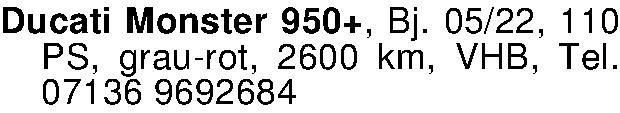 Anzeigentitel: Ducati Monster 950+, Bj. 05/22, 110 PS, grau-rot, 1900 km, VHB,