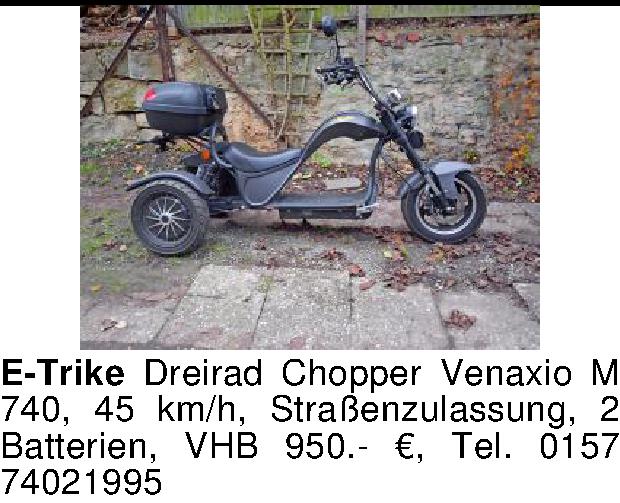 E-Trike Dreirad Chopper Venaxio M 740, 45 km/h, Straßenzulassung, 2 Batterien, VHB 950.- €, Tel. 0157 74021995