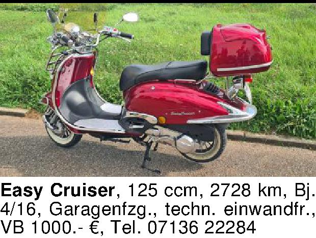 Easy Cruiser, 125 ccm, 2728 km, Bj. 4/16, Garagenfzg., techn. einwandfr., VB 1000.- €, Tel. 07136 22284