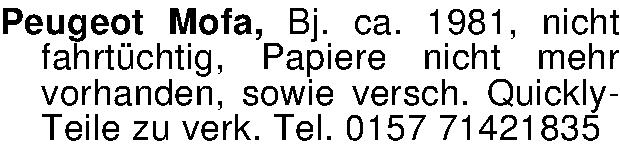 Peugeot Mofa, Bj. ca. 1981, nicht fahrtüchtig, Papiere nicht mehr vorhanden, sowie versch. Quickly-Teile zu verk. Tel. 0157 71421835