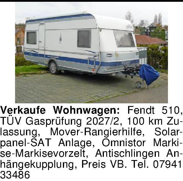 Verkaufe Wohnwagen: Fendt 510, TÜV Gasprüfung 2027/2, 100 km Zulassung, Mover-Rangierhilfe, Solarpanel-SAT Anlage, Omnistor Markise-Markisevorzelt, Antischlingen Anhängekupplung, Preis VB. Tel. 07941 33486