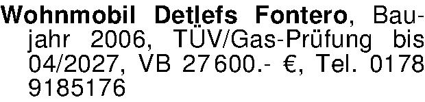 Wohnmobil Detlefs Fontero, Baujahr 2006, TÜV/Gas-Prüfung bis 04/2027, VB 27 600.- €, Tel. 0178 9185176