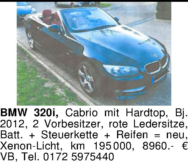 Anzeigentitel: BMW 320i, Cabrio mit Hardtop, Bj. 2012, 2 Vorbesitzer, rote Lede