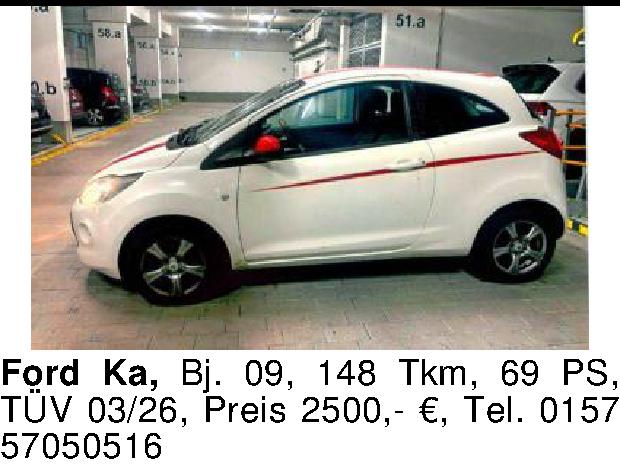 Anzeigentitel: Ford Ka, Bj. 09, 148 Tkm, 69 PS, TÜV 03/26, Preis 2500,- €, Tel.