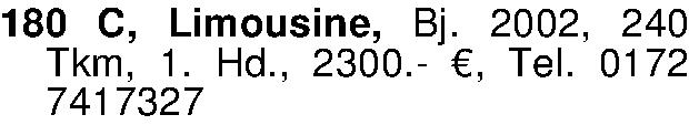 Anzeigentitel: 180 C, Limousine, Bj. 2002, 240 Tkm, 1. Hd., 2300.- €, Tel. 0172