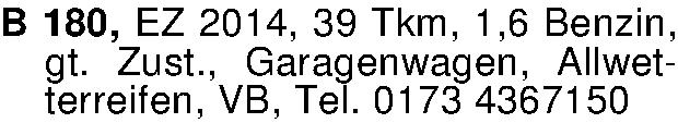 B 180, EZ 2014, 39 Tkm, 1,6 Benzin, gt. Zust., Garagenwagen, Allwetterreifen, VB, Tel. 0173 4367150