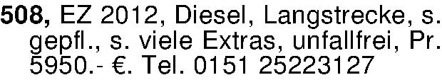 508, EZ 2012, Diesel, Langstrecke, s. gepfl., s. viele Extras, unfallfrei, Pr. 5950.- €. Tel. 0151 25223127