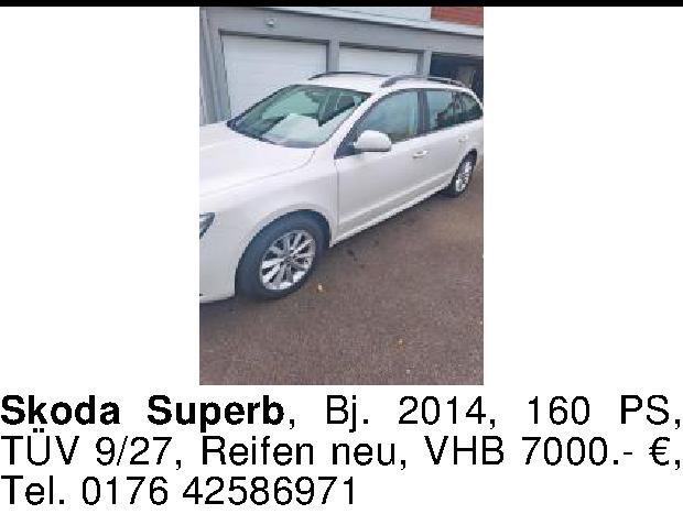 Skoda Superb, Bj. 2014, 160 PS, TÜV 9/27, Reifen neu, VHB 7000.- €, Tel. 0176 42586971