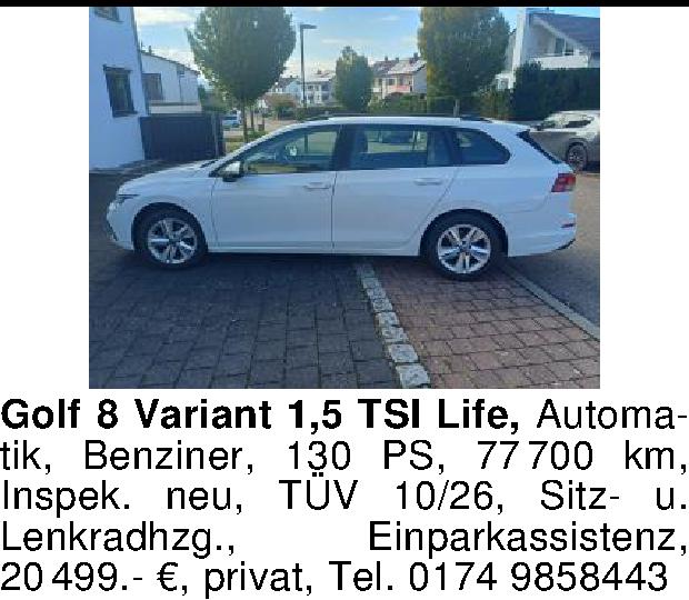 Anzeigentitel: Golf 8 Variant 1,5 TSI Life, Automatik, Benziner, 130 PS, 77 700