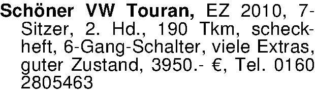 Anzeigentitel: Schöner VW Touran, EZ 2010, 7-Sitzer, 2. Hd., 190 Tkm, scheckhef