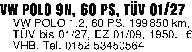 VW POLO 9N, 60 PS, TÜV 01/27VW POLO 1.2, 60 PS, 199 850 km,TÜV bis 01/27, EZ 01/09, 1950.- € VHB. Tel. 0152 53450564