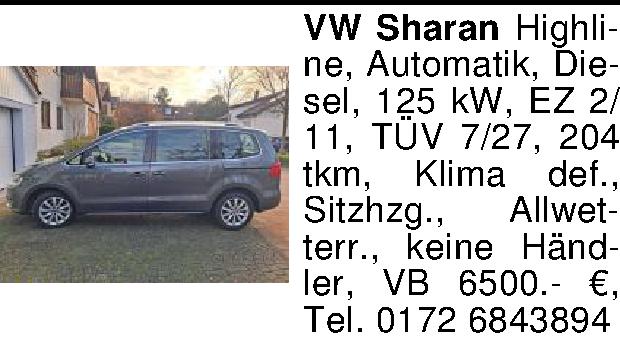 Anzeigentitel: VW Sharan Highline, Automatik, Diesel, 125 kW, EZ 2/11, TÜV 7/27