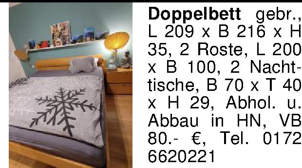 Doppelbett gebr., L 209 x B 216 x H 35, 2 Roste, L 200 x B 100, 2 Nacht­tische, B 70 x T 40 x H 29, Abhol. u. Abbau in HN, VB 80.- €, Tel. 0172 6620221