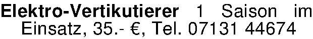 Anzeigentitel: Elektro-Vertikutierer 1 Saison im Einsatz, 35.- €, Tel. 07131 44