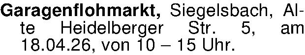 Anzeigentitel: Garagenflohmarkt, Siegelsbach, Alte Heidelberger Str. 5, am 18.0