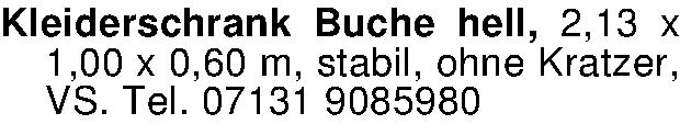 Kleiderschrank Buche hell, 2,13 x 1,00 x 0,60 m, stabil, ohne Kratzer, VS. Tel. 07131 9085980