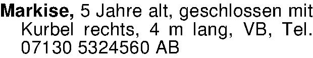 Markise, 5 Jahre alt, geschlossen mit Kurbel rechts, 4 m lang, VB, Tel. 07130 5324560 AB