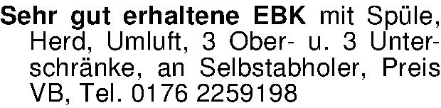 Sehr gut erhaltene EBK mit Spüle, Herd, Umluft, 3 Ober- u. 3 Unterschränke, an Selbstabholer, Preis VB, Tel. 0176 2259198