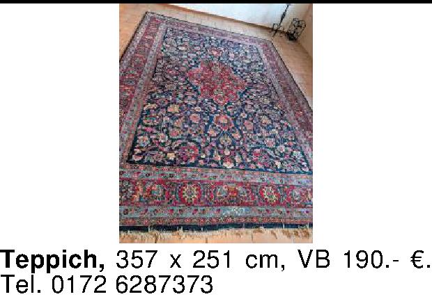 Teppich, 357 x 251 cm, VB 190.- €. Tel. 0172 6287373