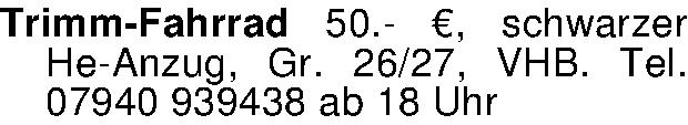 Anzeigentitel: Trimm-Fahrrad 50.- €, schwarzer He-Anzug, Gr. 26/27, VHB. Tel. 0