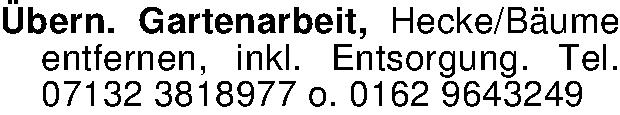 Übern. Gartenarbeit, Hecke/Bäume entfernen, inkl. Entsorgung. Tel. 07132 3818977 o. 0162 9643249