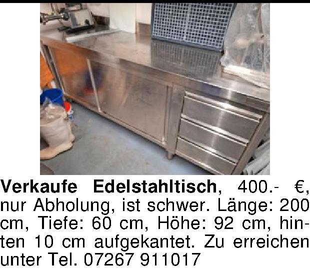 Anzeigentitel: Verkaufe Edelstahltisch, 400.- €, nur Abholung ist schwer. Länge