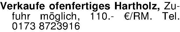 Anzeigentitel: Verkaufe ofenfertiges Hartholz, Zufuhr möglich, 110.- €/RM. Tel.