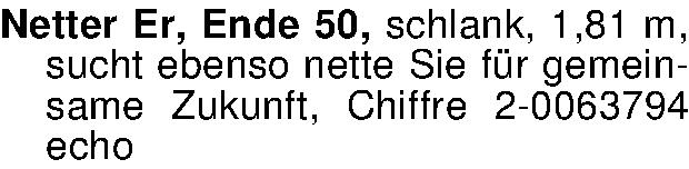 Netter Er, Ende 50, schlank, 1,81 m, sucht ebenso nette Sie für gemeinsame Zukunft, Chiffre 2-0063794 echo