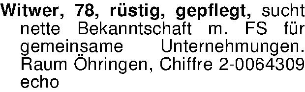 Witwer, 78, rüstig, gepflegt, sucht nette Bekanntschaft m. FS für ­gemeinsame Unternehmungen. Raum Öhringen, Chiffre 2-0064309 echo
