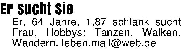 Er sucht SieEr, 64 Jahre, 1,87 schlank sucht Frau, Hobbys: Tanzen, Walken, Wandern. leben.mail@web.de