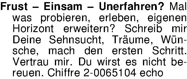 Frust – Einsam – Unerfahren? Mal was probieren, erleben, eigenen Horizont erweitern? Schreib mir Deine Sehnsucht, Träume, Wünsche, mach den ersten Schritt. Vertrau mir. Du wirst es nicht bereuen. Chiffre 2-0065104 echo